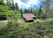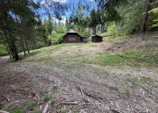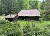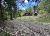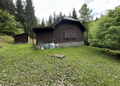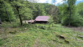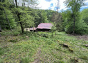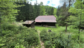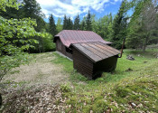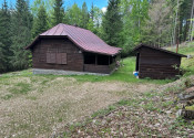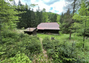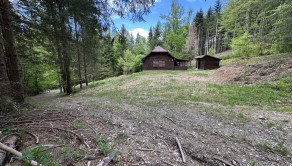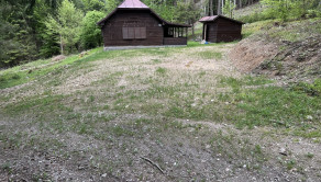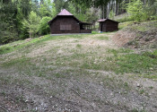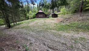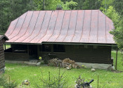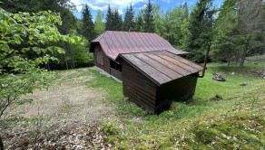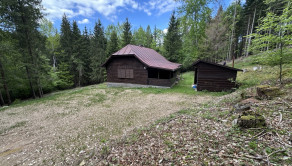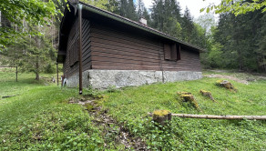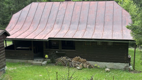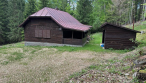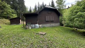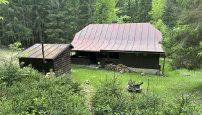 Drevená chata v lese, ticho dookola, príroda, pokoj a zelená všade.