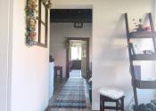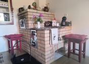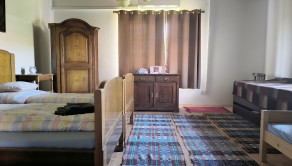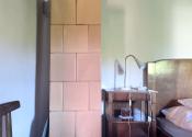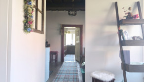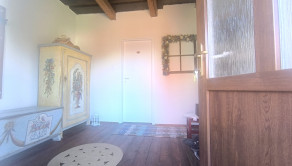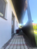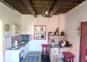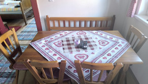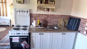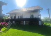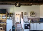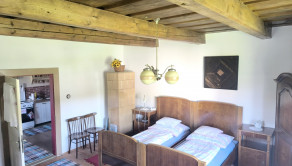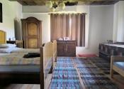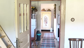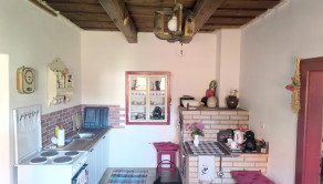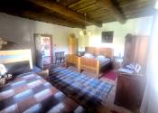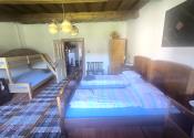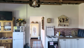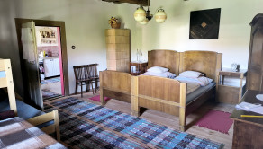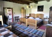 Vyvýšený drevený gánog s lavicou na sedenie, vstupná chodba, kúpeľňa so sprchovým kútom a toaletou, kuchyňa s jedálenským stolom a stoličkami, velikánska izba využívaná ako obývačka a spálňa. V kuchyni sa nachádza murovaný šporák, elektrický šporák s rúrou na pečenie, v spálni je kachľová pec a klimatizácia.
