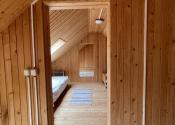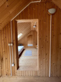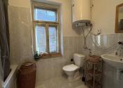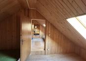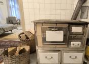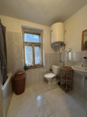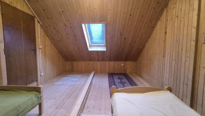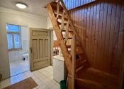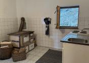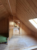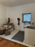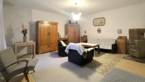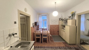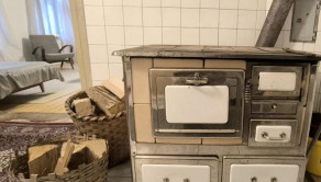 Prízemie: vstupná chodba, kúpeľňa s vaňou a toaletou, kuchyňa s jedálenským kútom a funkčným šporákom na drevo, priestranná obývačka s nádhernou dobovou keramickou pecou.