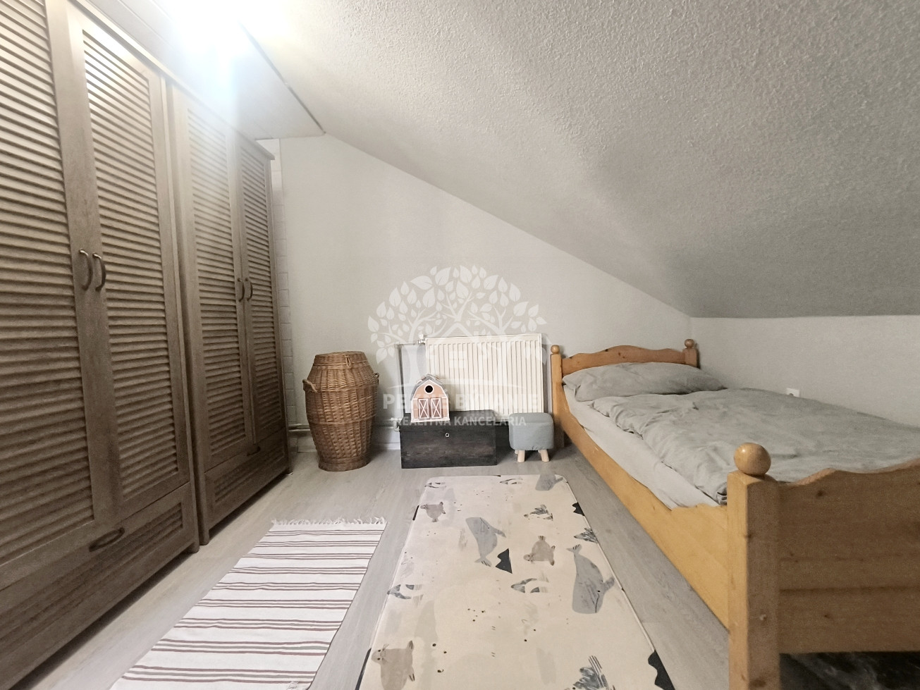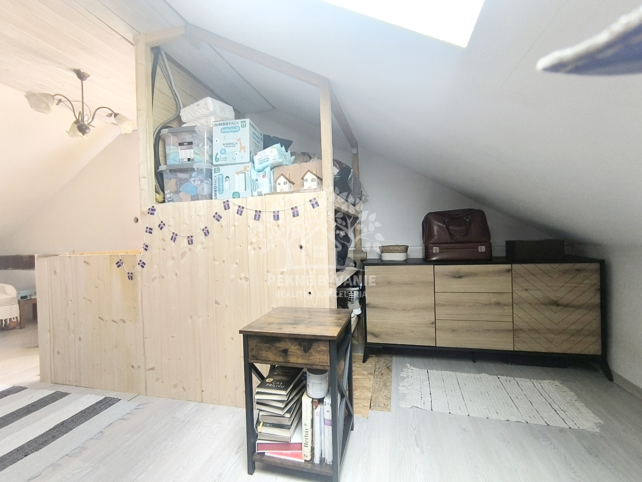 Dispozícia: vstupná chodba, toaleta, kuchyňa, obývačka, kúpeľňa s vaňou, schody do podkrovia, kde sú dve izby - spálňa, detská izba a čitáreň. Dom má jednu stenu spoločnú so susedným domom - odhlučnené.