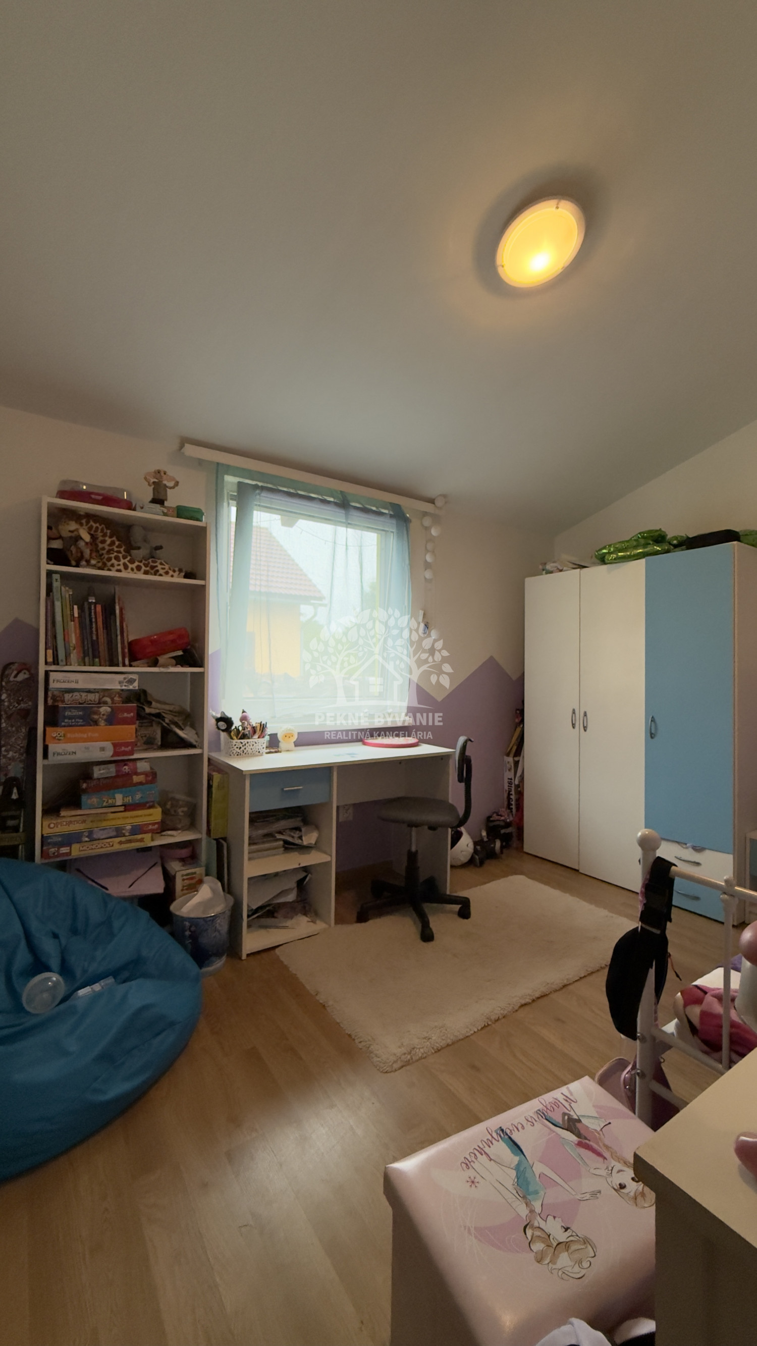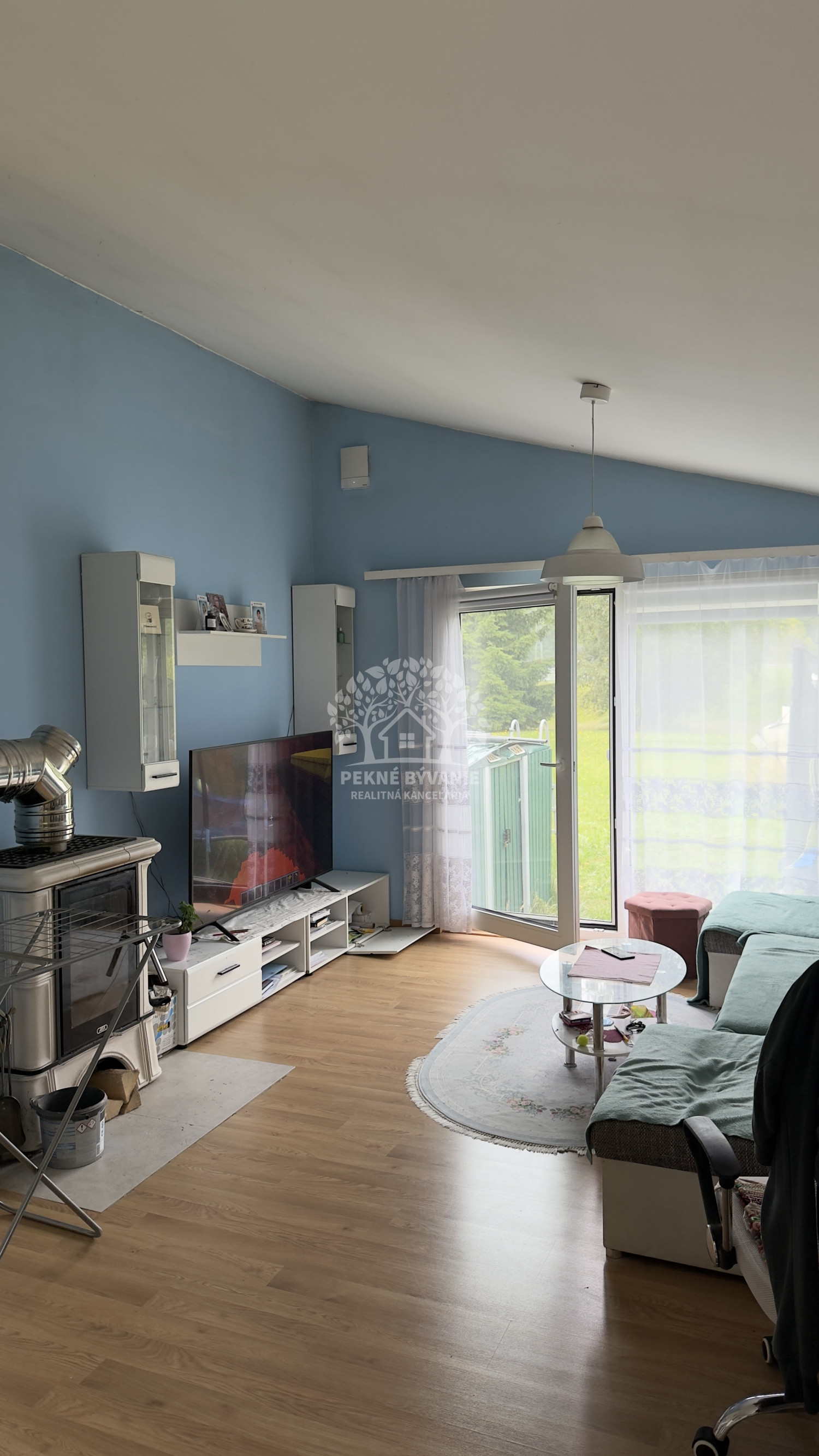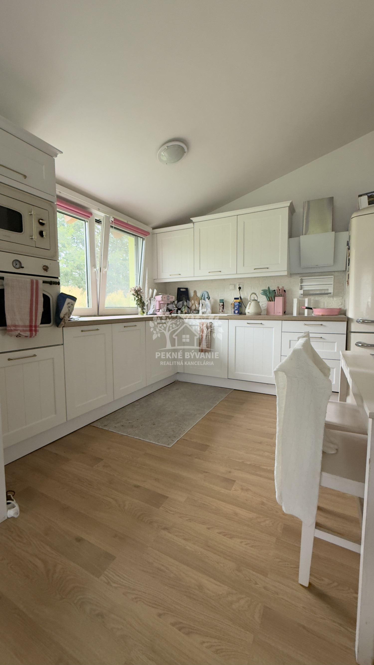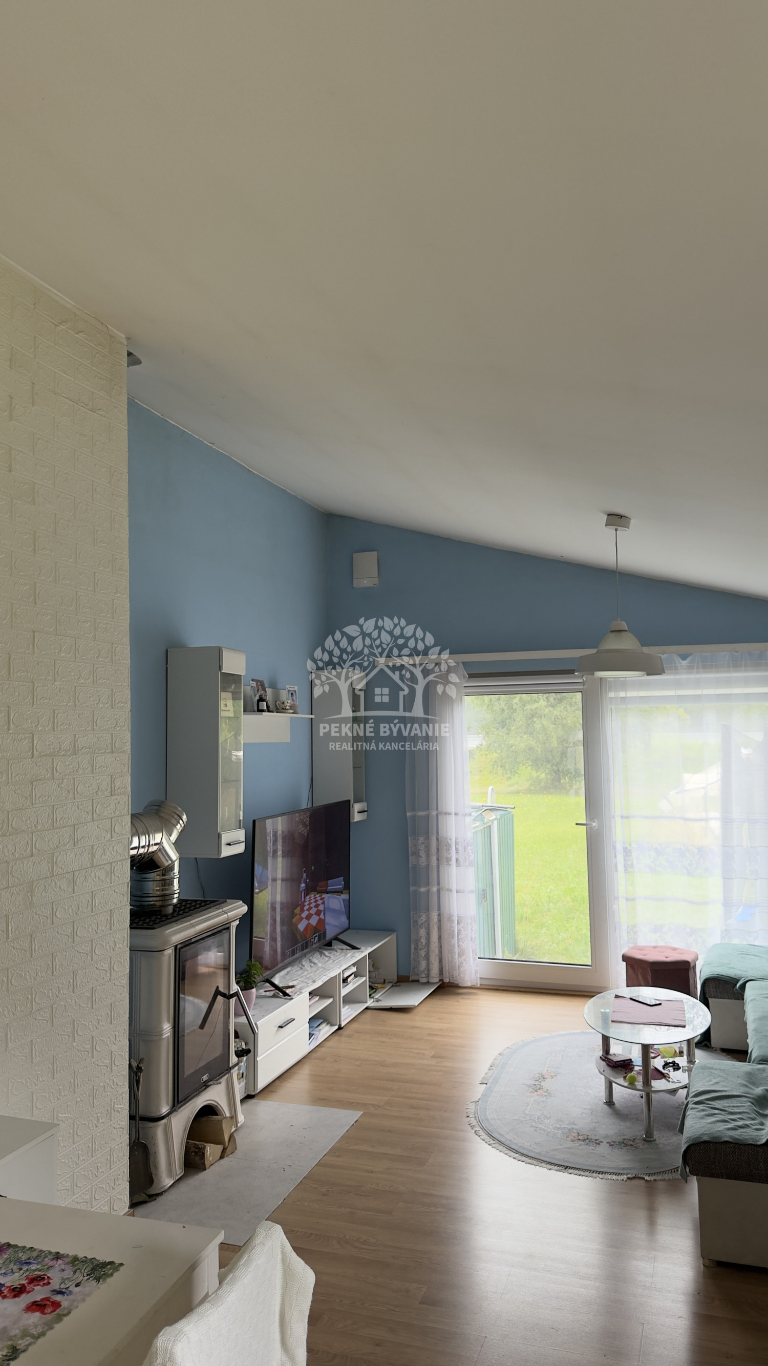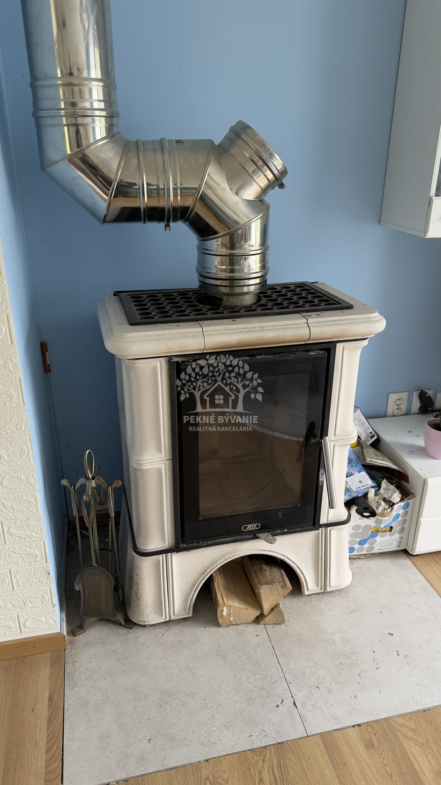 DISPOZÍCIA: chodba, samostatná toaleta, kúpeľňa so sprchovým kútom aj vaňou, kuchyňa s kuchynskou linkou na mieru spojená s obývacou miestnosťou s krbovými kachľami, 2 detské izby, spálňa.