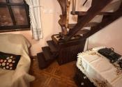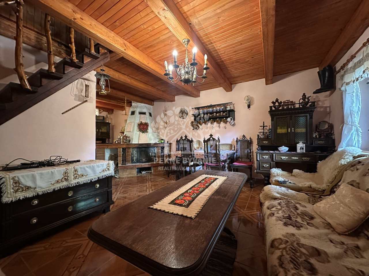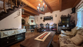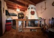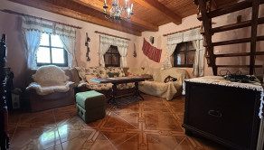 Obývacia izba: keramická dlažba, omietky, televízna skrinka, okná (západ a juh), osvetlenie, krb, obývacia zostava, výstup na poschodie, stoličky s jedálenským stolom