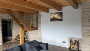 Pozostáva z obývacej izby s kuchyňou ( predpríprava na kuchynskú linku) a kúpeľňou s toaletou. Po schodoch sa vchádza na poschodie kde sú dve izby.