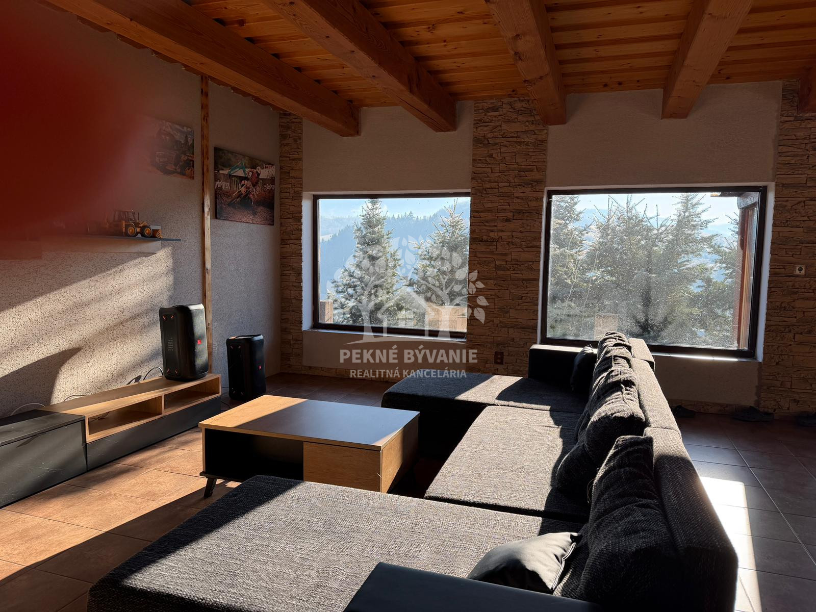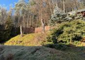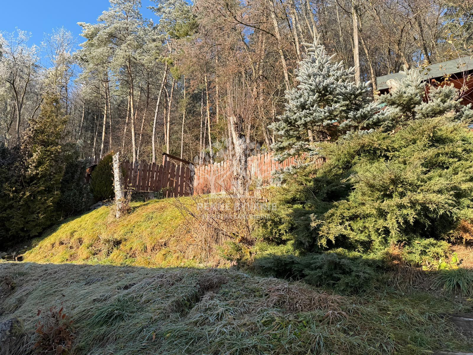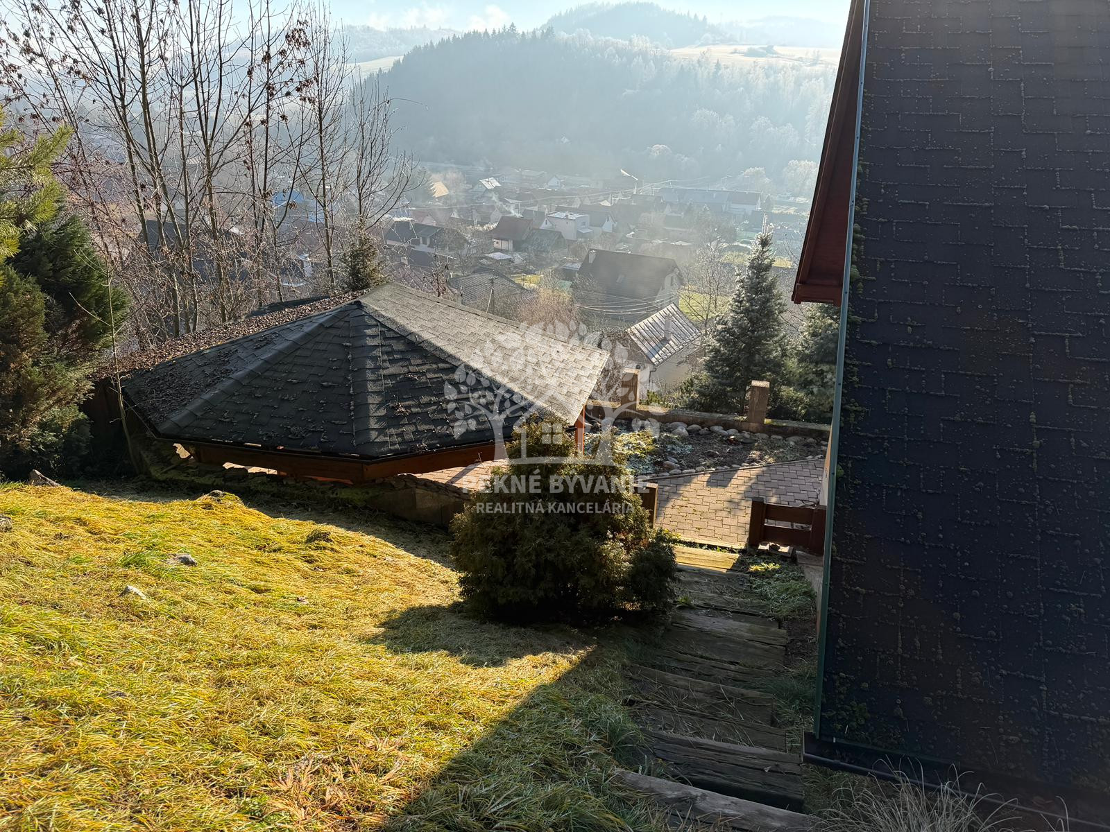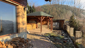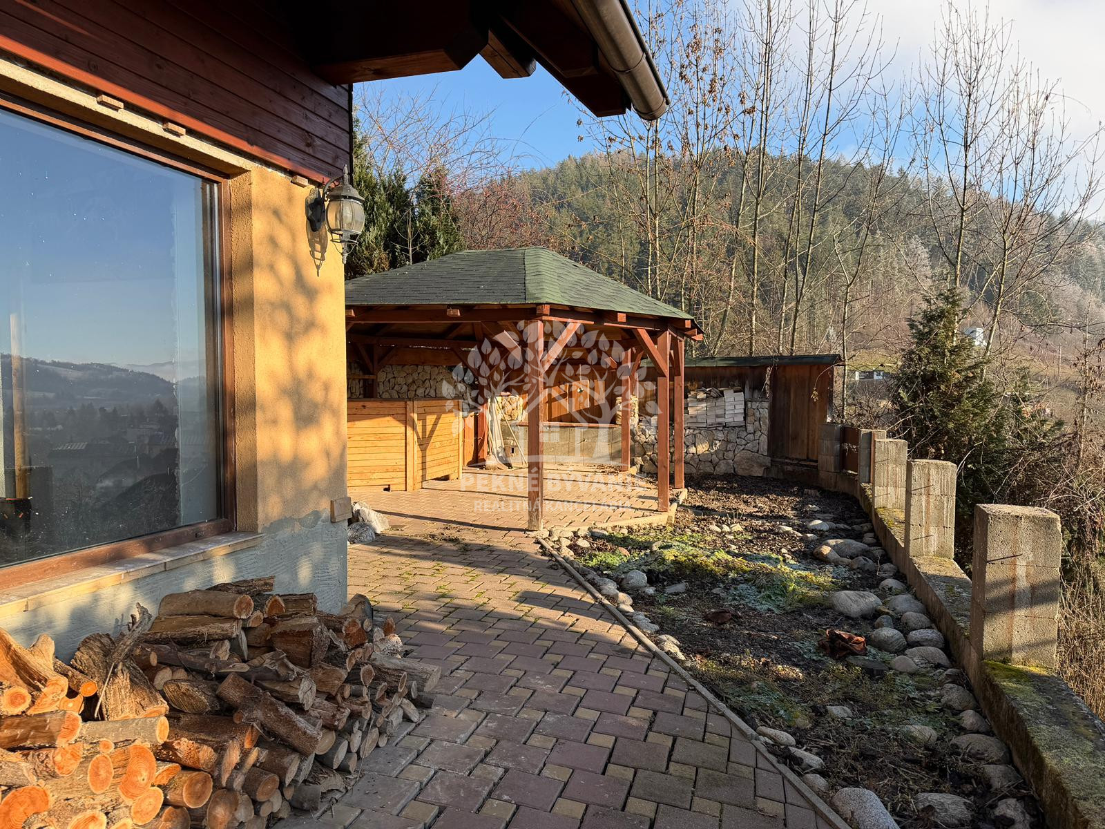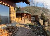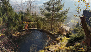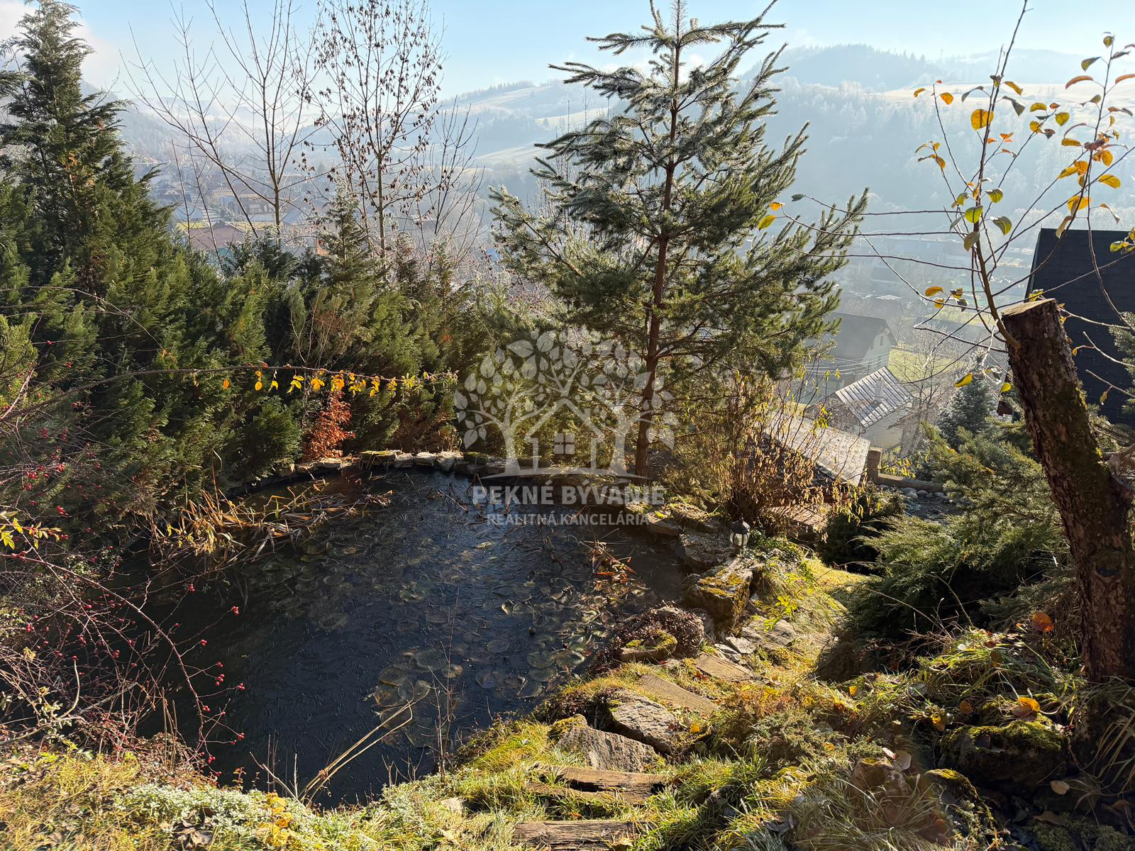 Nehnuteľnosť sa nachádza na kopci na kaskádovitom, slnečnom pozemku s jazierkom, altánkom a hosťovskou chalúpkou.