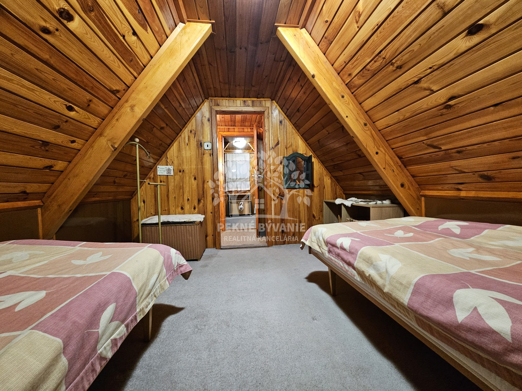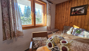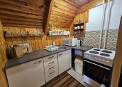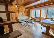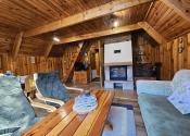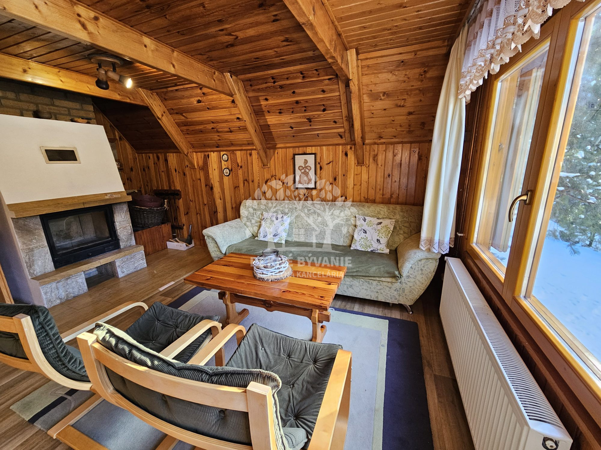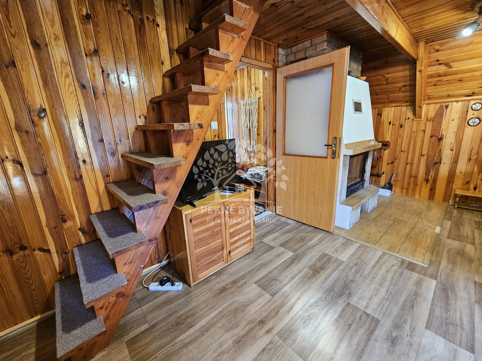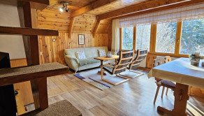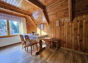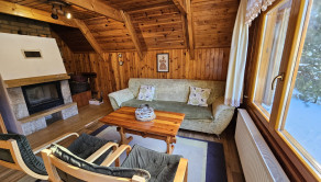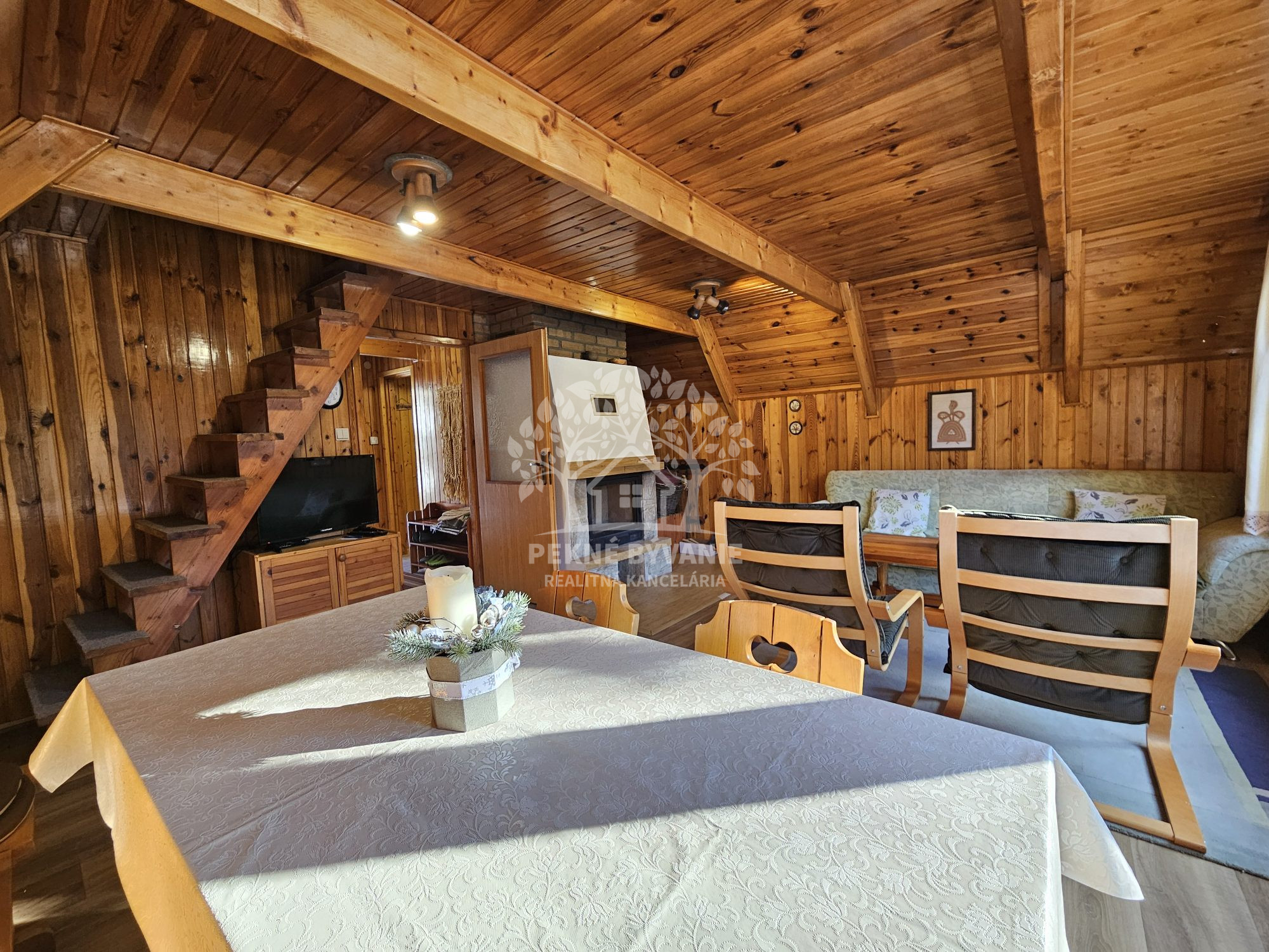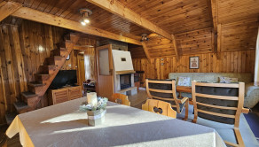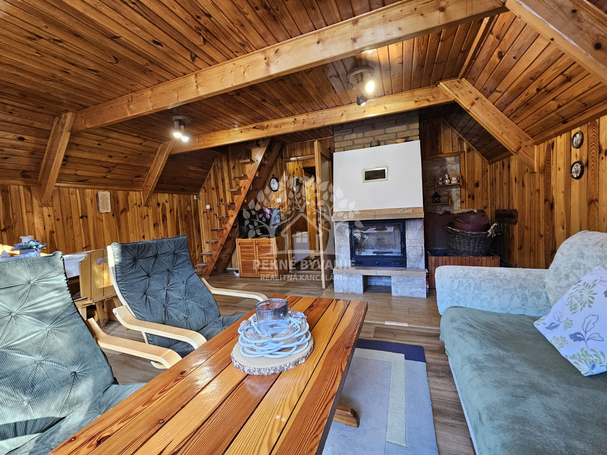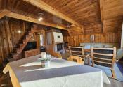 Poschodie- oddychová miestnosť s krbom, kuchyňa a výstup drevenými schodmi do podkrovia, kde je nočná časť s dvoma samostatnými izbami.