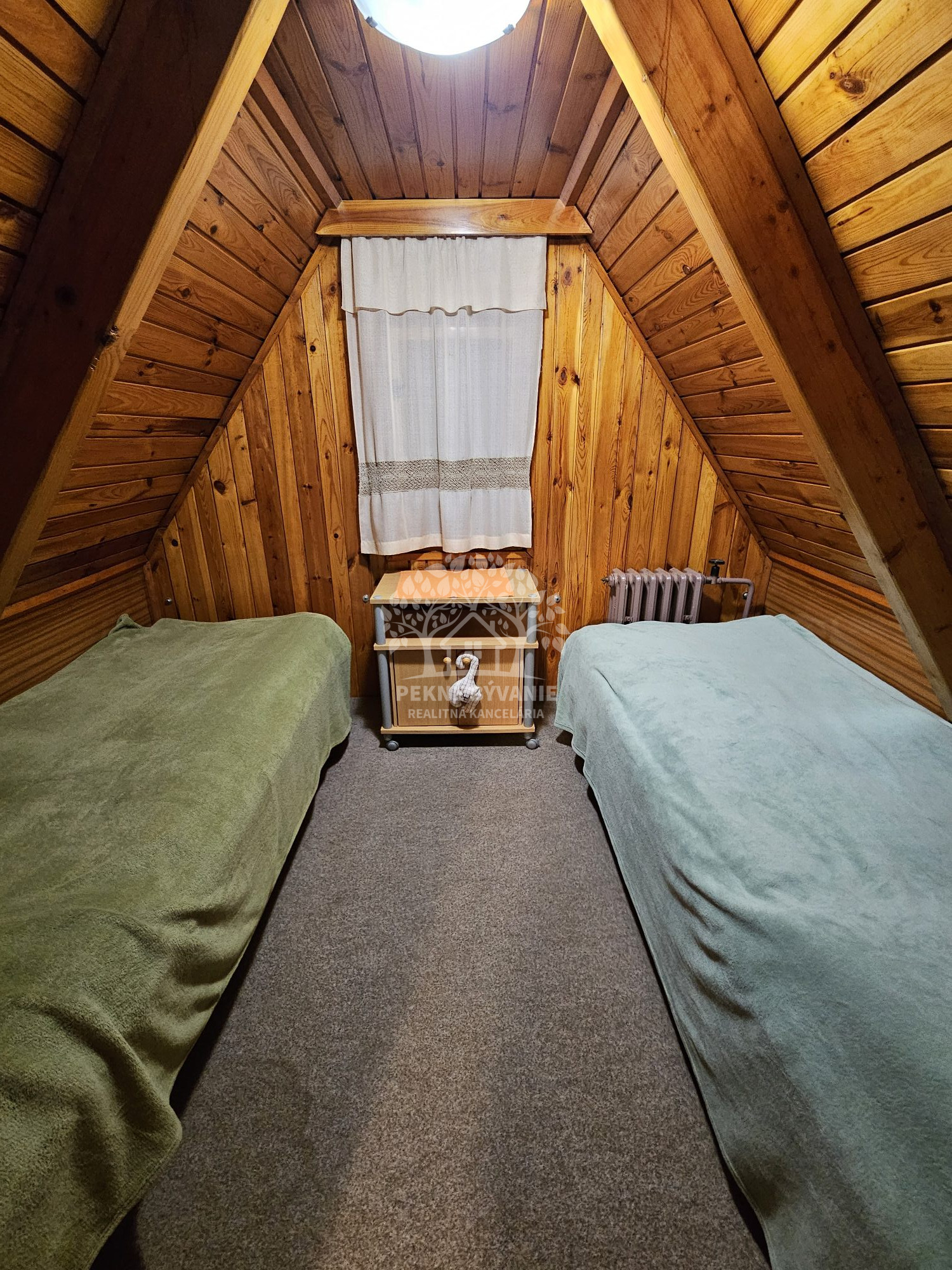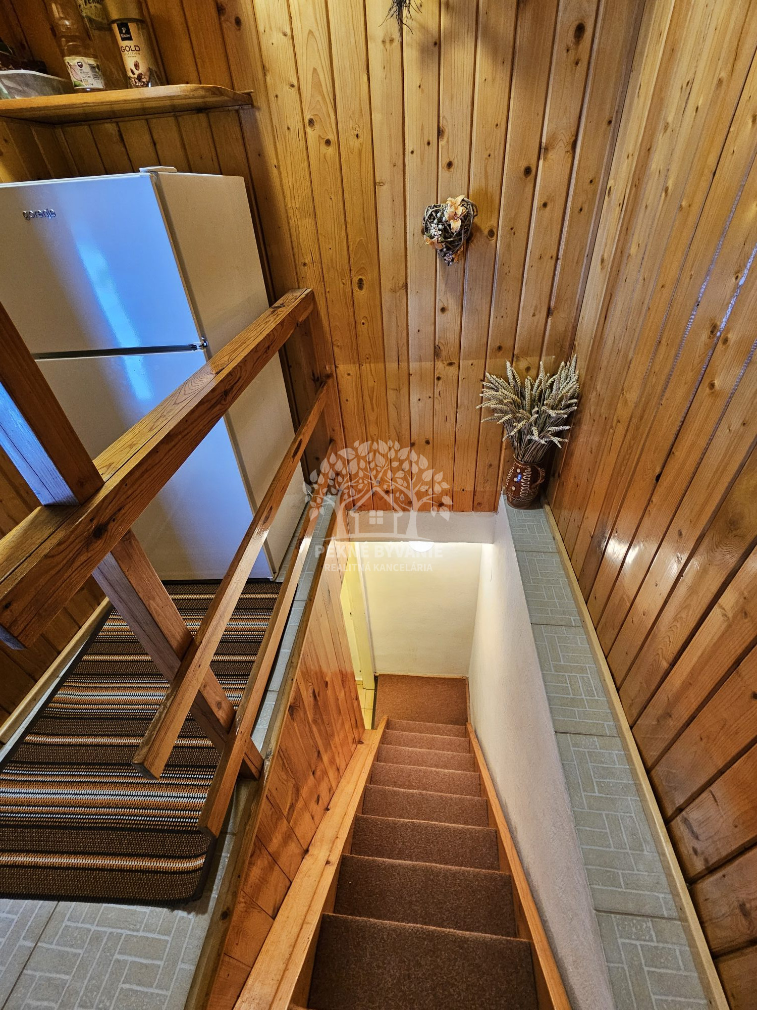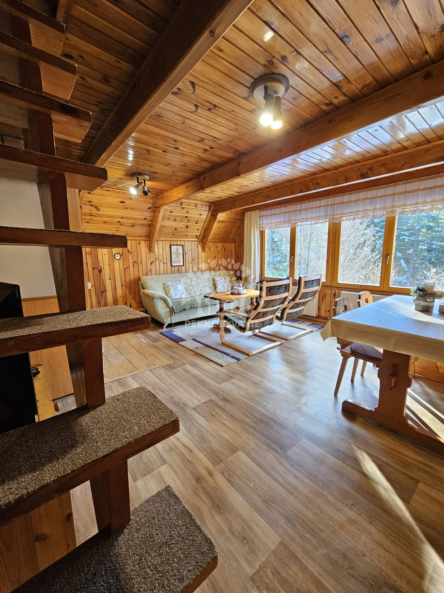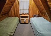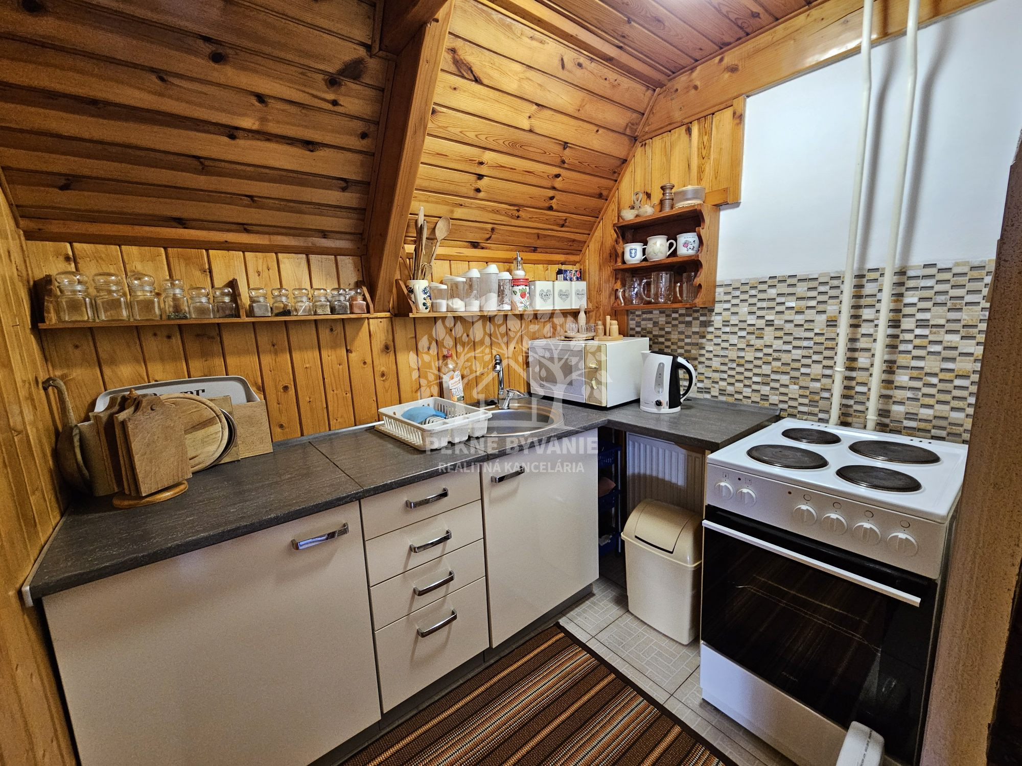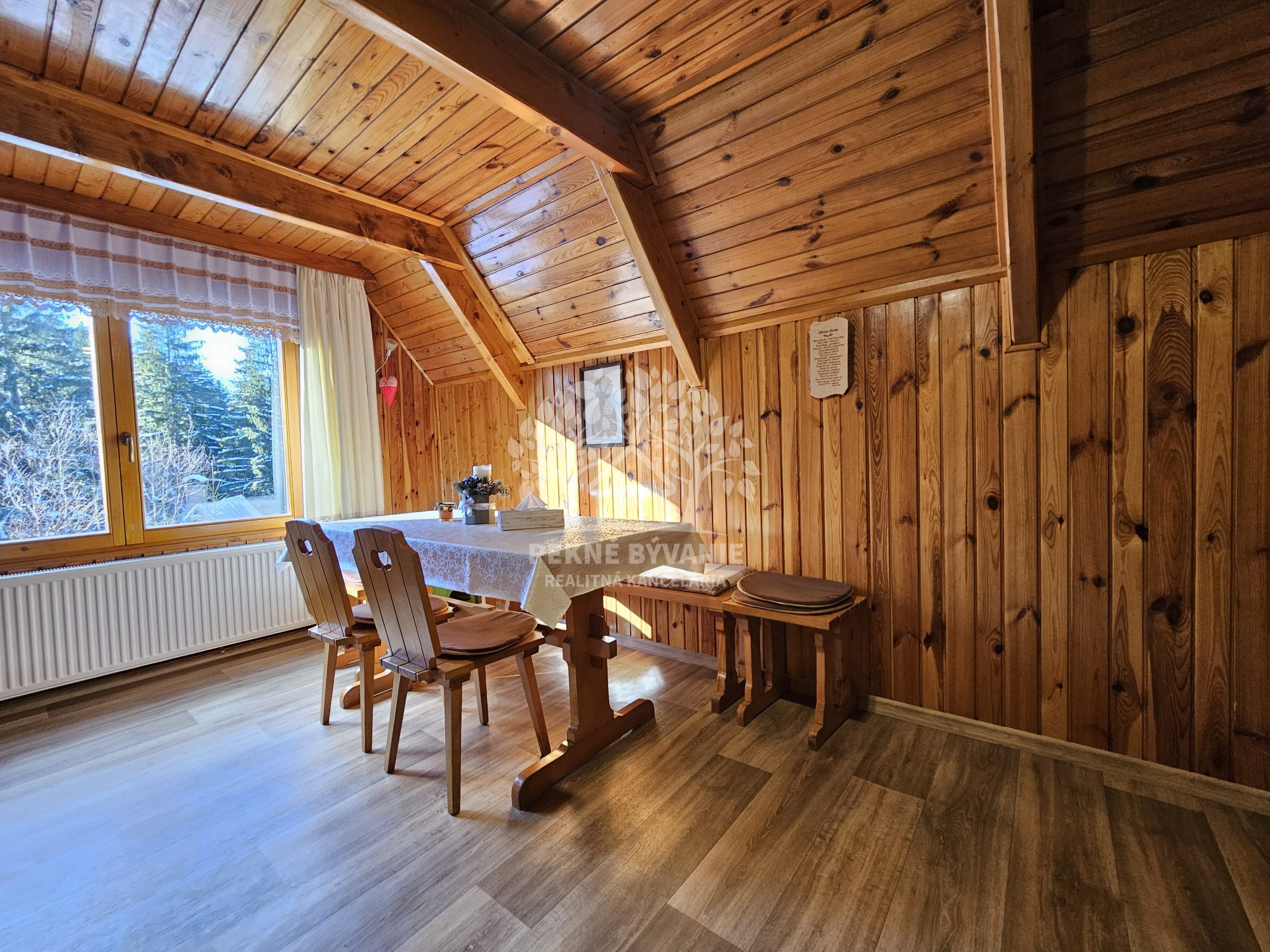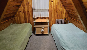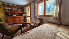 Poschodie- oddychová miestnosť s krbom, kuchyňa a výstup drevenými schodmi do podkrovia, kde je nočná časť s dvoma samostatnými izbami.