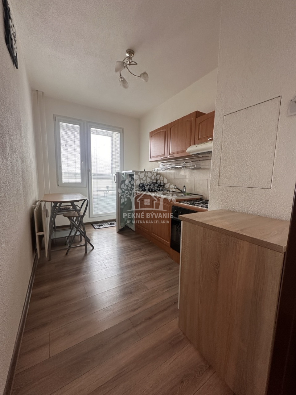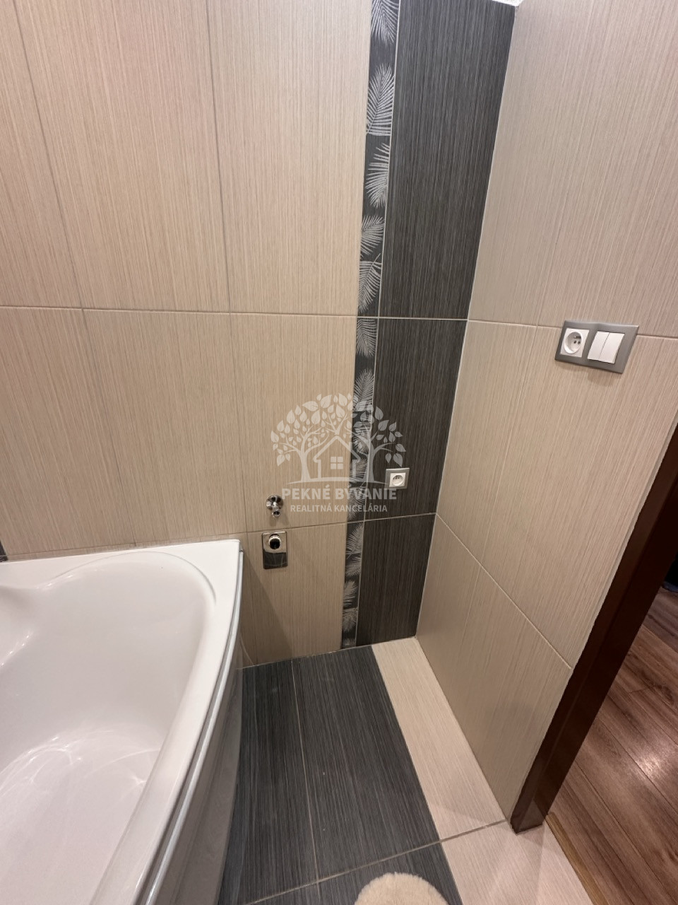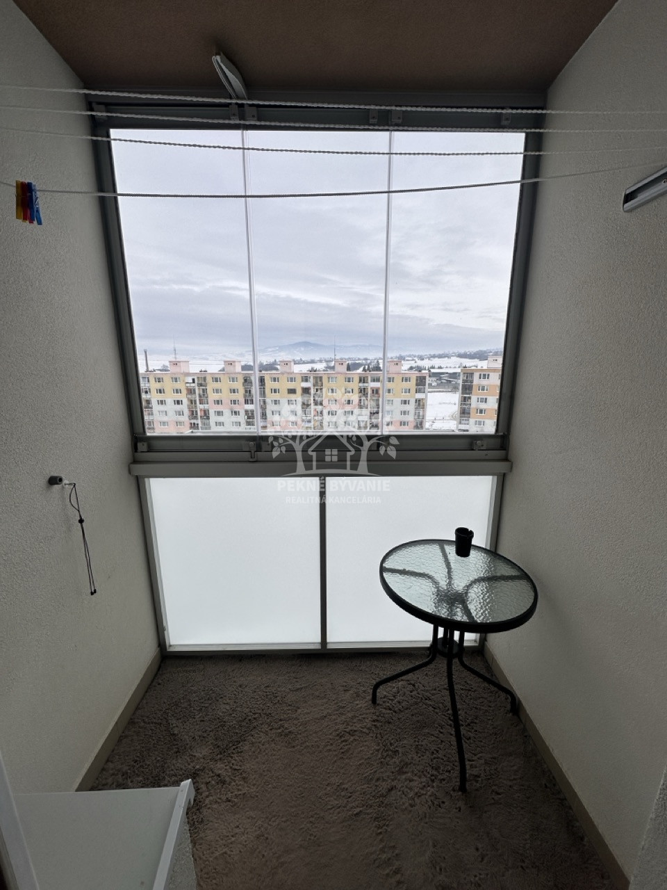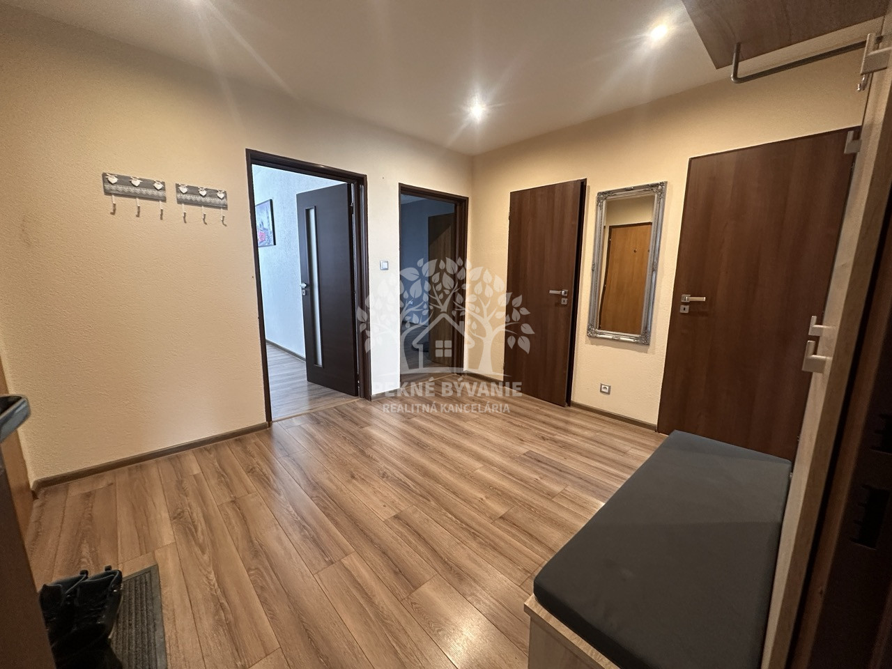 Dispozícia bytu pozostáva zo vstupnej chodby z keramickou dlažbou (bytový telefón, vešiakova zostava, botník, vstup do každej izby). V byte sa nachádzajú spálňa, detská izba, obývačka, kuchyňa, kúpeľňa, wc (wc systém geberit, rohová vaňa, keramický obklad je na 3/4 stien, osvetlenie, bodové svetlá, vstavané odkladacie priestory a na mieru robené skrinky, odsávanie). Samozrejmosťou sú stierky.