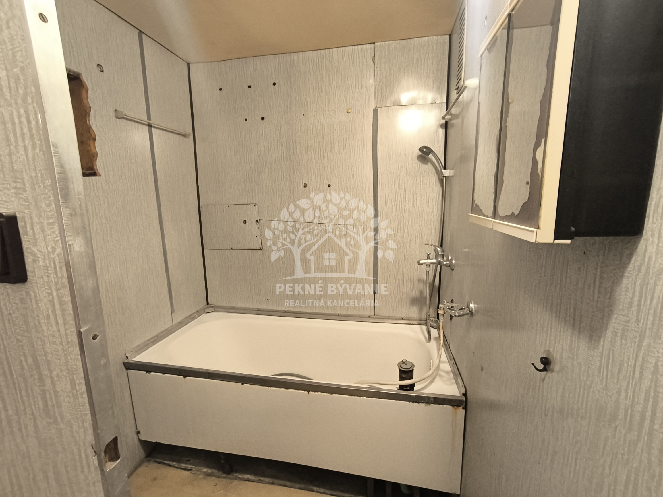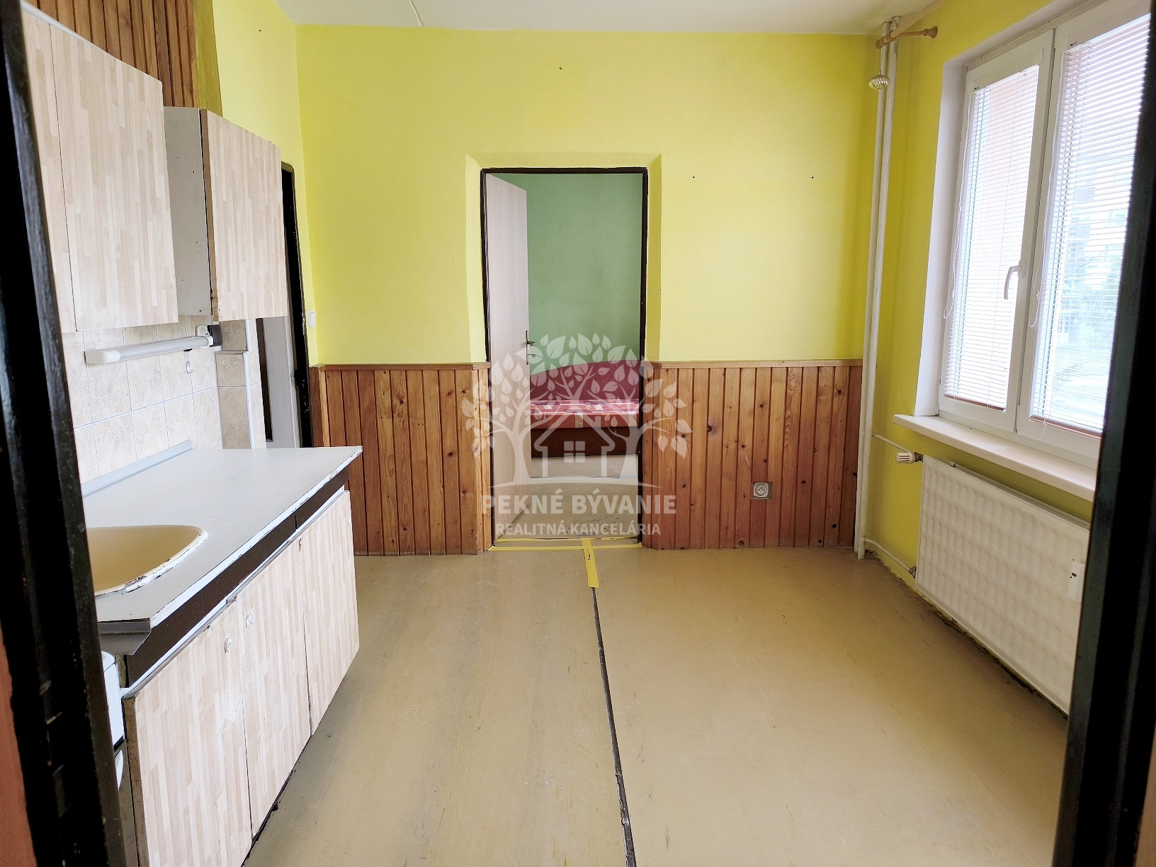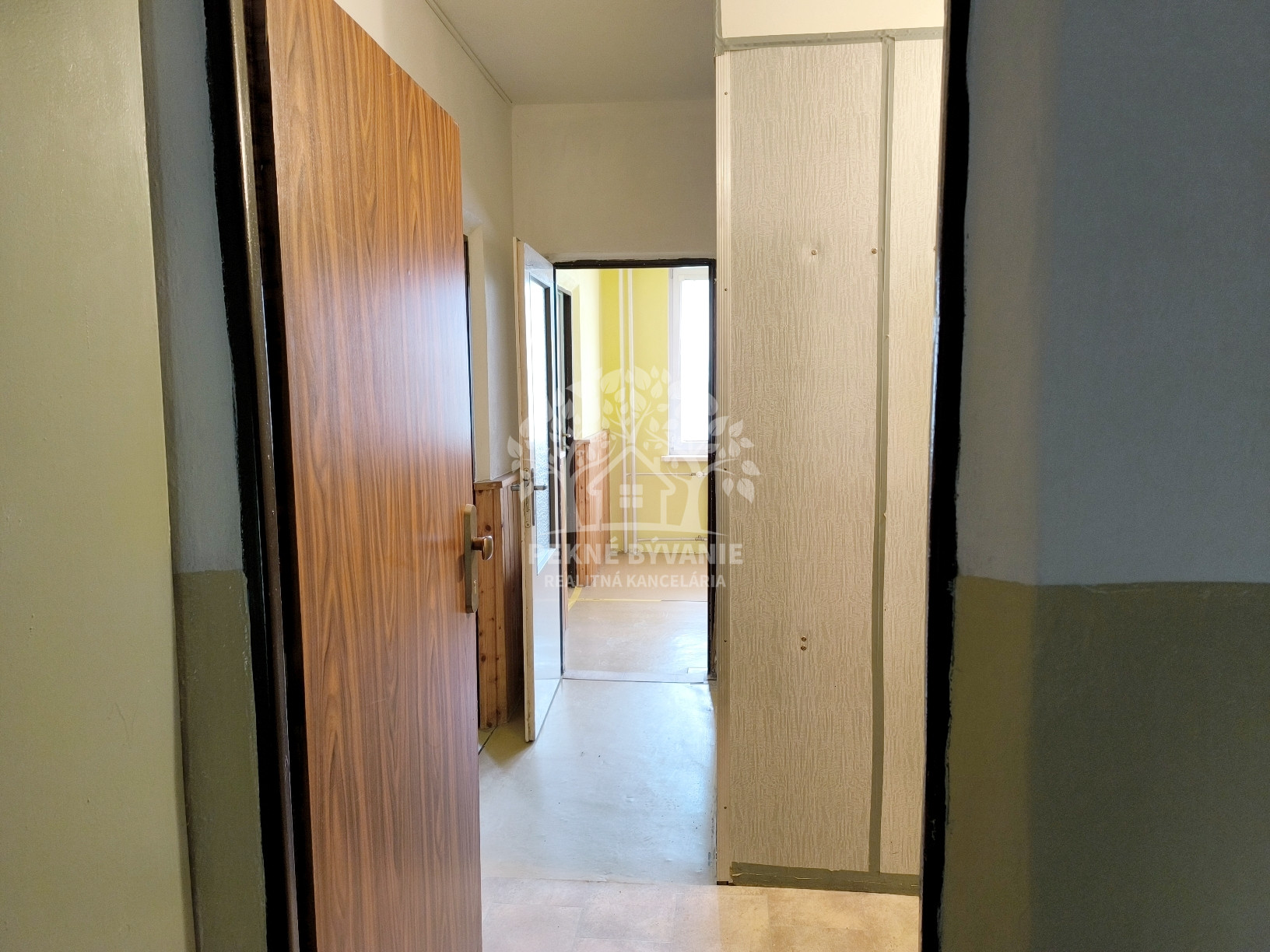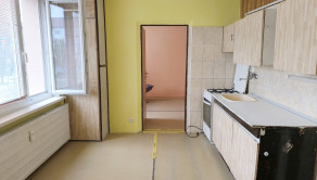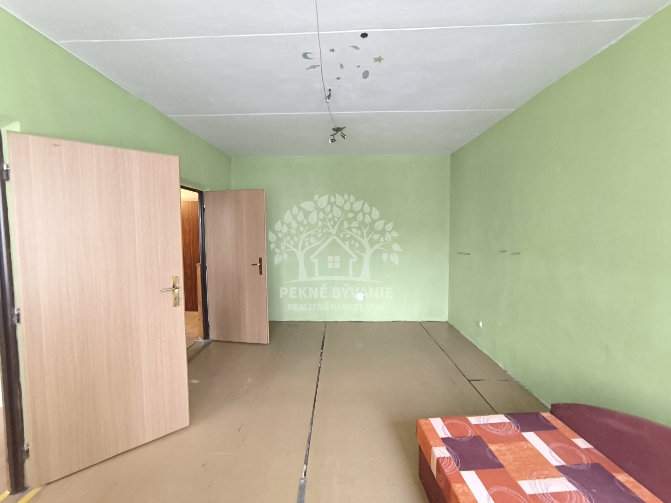 Dispozícia: vstupná chodba, kúpeľňa s vaňou a osobitne toaleta, kuchyňa, obývačka /možné rozdeliť na dve izby,/ spálňa.
