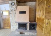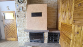 Apartmán č.1: vstupná chodba, kuchyňa, kúpeľňa s vaňou a toaletou, izba s krbom pohovkou a posteľou.